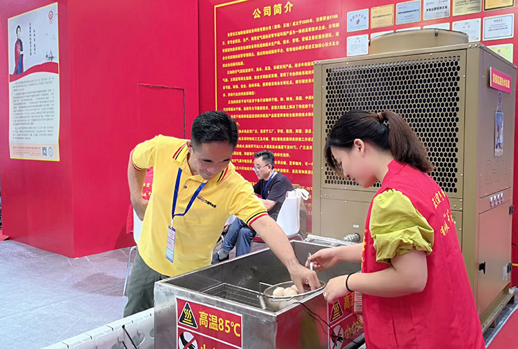 該系列產品采用變頻技術,切實解決嚴寒地區大面積熱水不穩定等問題。前來觀展的客戶圍繞在復疊高溫熱水機組旁,吃著美味的水煮蛋,聆聽正旭工作人員詳細的產品介紹,更直觀的感受到其卓越的產品性能。